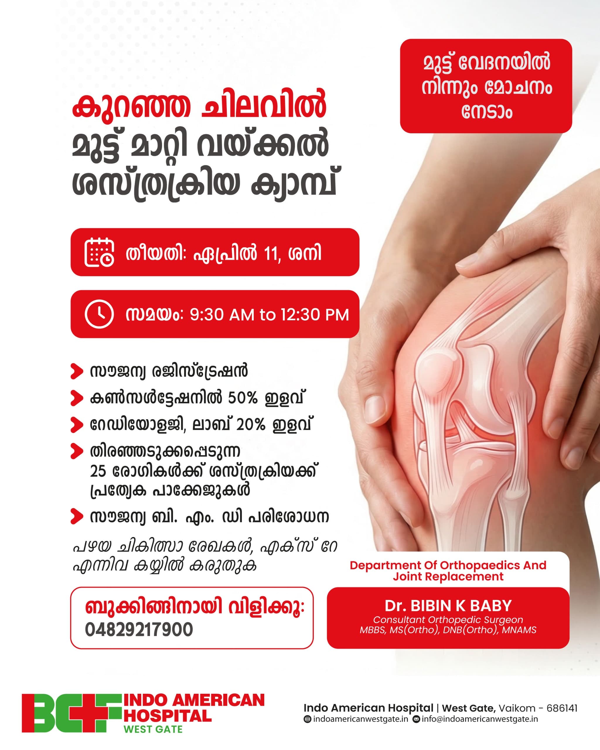 വൈക്കം: വൈക്കം ഇൻഡോ അമേരിക്കൻ ആശുപത്രിയിൽ ഓർത്തോസർജറി വിഭാഗത്തിലെ ഡോ. ബിബിൻ കെ.ബേബിയുടെ നേതൃത്വത്തിൽ 11 ന് രാവിലെ 9.30 മുതൽ ഉച്ചക്ക് 12.30 വരെ മുട്ട് മാറ്റിവയ്ക്കൽ ശസ്ത്രക്രിയ ക്യാമ്പ് നടത്തും. രജിസ്ട്രേഷൻ സൗജന്യമാണ്. കൺസൾട്ടേഷനിൽ 50 % ഇളവും, റേഡിയോളജി, ലാബ് എന്നിവയ്ക്ക് 20% ഇളവും, സൗജന്യ ബി.എം.ഡി പരിശോധനയും ഉണ്ടായിരിക്കും.