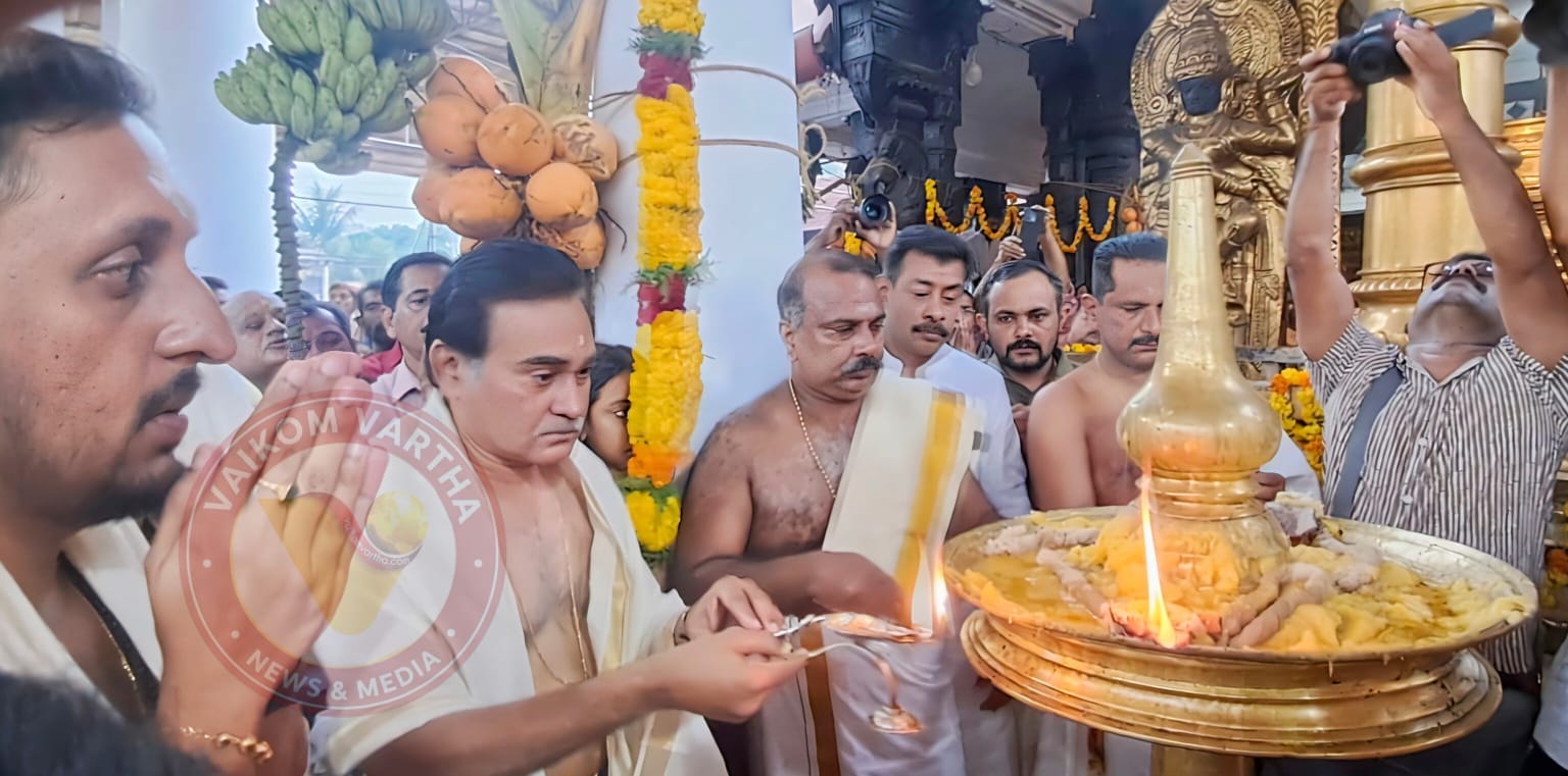 വൈക്കം: പഞ്ചാക്ഷരിയുടെയും വേദമന്ത്രങ്ങളുടേയും നിറവിൽ മഹാദേവർക്ക് കൊടിയേറ്റ്. മഹാദേവക്ഷേത്രത്തിലെ സ്വർണ്ണ ധ്വജത്തിൽ ശ്രീമഹാദേവൻ്റെ ദേവമുദ്ര ആലേഖനം ചെയ്ത കൊടിക്കൂറ ഉയർന്നത് ആചാരപ്രകാരം ഉത്തരദിക്കിൽ. തന്ത്രിമുഖ്യന്മാരായ ഭദ്രകാളി മറ്റപ്പള്ളി നാരായണൻ നമ്പൂതിരി, കിഴക്കിനിയേടത്ത് മേക്കാട് മാധവൻ നമ്പൂതിരി എന്നിവരുടെ സാന്നിധ്യത്തിൽ തന്ത്രി ഭദ്രകാളി മറ്റപ്പള്ളി പരമേശ്വരൻ നമ്പൂതിരിയാണ് കൊടിയേറ്റിയത്. വൈക്കം ക്ഷേത്രത്തിലെ രണ്ട് തന്ത്രിമാരിൽ ഭദ്രകാളി മറ്റപ്പള്ളി തന്ത്രിയാണ് കൊടിയേറ്റുന്നതെങ്കിൽ ധ്വജത്തിൻ്റെ ഉത്തര ദിക്കിലും മേക്കാടനാണെങ്കിൽ ദക്ഷിണദിക്കിലുമാണ് ആചാരമനുസരിച്ച് കൊടിയേറുക. ഉഷ:പൂജ, എതൃത്തപൂജ, പന്തീരടി പൂജ എന്നിവക്ക് ശേഷം ശ്രീകോവിലിൽ നിന്ന് ദേവചൈതന്യം അവാഹിച്ച കൊടിക്കൂറ കൊടിമരച്ചുവട്ടിലേക്ക് എഴുന്നള്ളിച്ചു. ബലിക്കൽപുരയിൽ നടന്ന ചടങ്ങുകൾക്ക് ശേഷം 6.44 നാണ് കൊടിയേറ്റ് നടന്നത്. നിലവിളക്കും നിറപറയും നെറ്റിപ്പട്ടം കെട്ടിയ മൂന്ന് ഗജവീരൻമാരും രണ്ട് സ്വർണ്ണക്കുടകളും വാദ്യമേളങ്ങളും കൊടിയേറ്റിന് അകമ്പടിയായി. മേൽശാന്തിമാരായ ടി.ഡി. നാരായണൻ നമ്പൂതിരി, ടി.എസ്. നാരായണൻ നമ്പൂതിരി, ശ്രീധരൻ നമ്പൂതിരി, അനുപ് നമ്പൂതിരി, കീഴ്ശാന്തിമാരായ ഏറാഞ്ചേരി ദേവൻ നമ്പൂതിരി, കൊളായി നാരായണൻ നമ്പൂതിരി, എന്നിവർ സഹകാർമ്മികരായി.