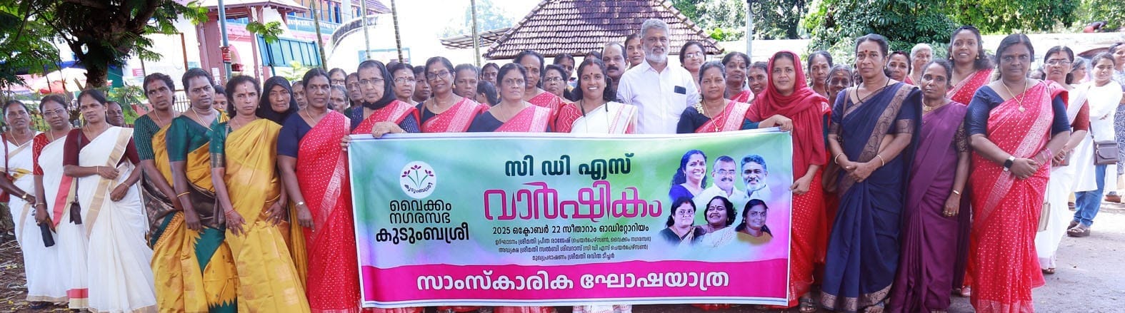 വൈക്കം: വൈക്കം നഗരസഭ കുടുംബശ്രീ സി.ഡി.എസ് വാര്ഷികവും സാംസ്കാരിക ഘോഷയാത്രയും സീതാറാം ഓഡിറ്റോറിയത്തില് പൊതു സമ്മേളനവും നടത്തി. നഗരസഭയുടെ 26 വാര്ഡുകളില്പ്പെട്ട 209 അയല്ക്കൂട്ടങ്ങളിലെ അംഗങ്ങള് സമ്മേളനത്തിലും ഘോഷയാത്രയിലും പങ്കെടുത്തു. സമ്മേളനത്തിന് സമാരംഭം കുറിച്ച് വടക്കേനട ദേവസ്വം ഗ്രൗണ്ടില്നിന്നും സമ്മേളനസ്ഥലമായ സീതാറാം ഓഡിറ്റോറിയത്തിലേക്ക് സാംസ്കാരിക ഘോഷയാത്ര നടത്തി. വാദ്യമേളങ്ങളും അലങ്കാരങ്ങളും ഘോഷയാത്രയെ ശ്രദ്ധേയമാക്കി.