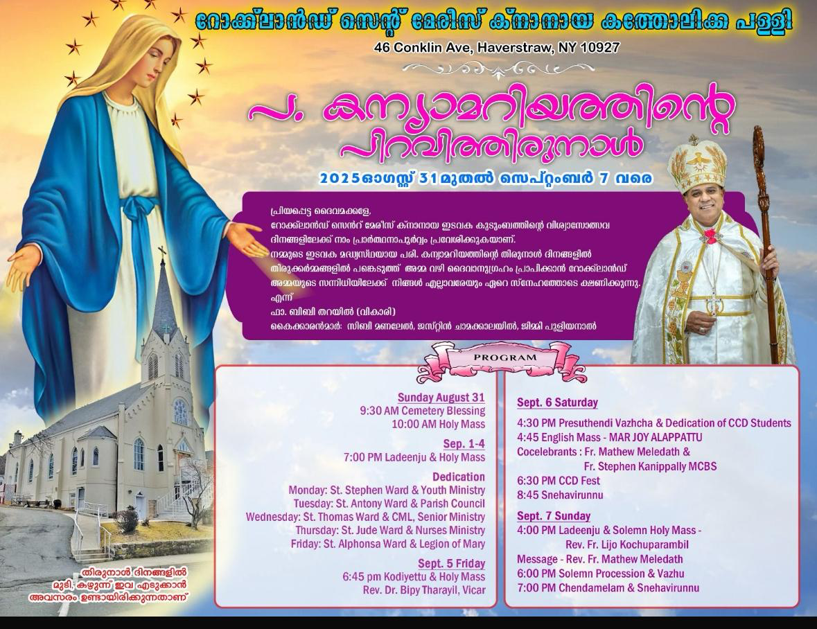 പരിശുദ്ധ കന്യക മാതാവിന്റെ തിരുന്നാൾ ഓഗസ്റ്റ് 31 മുതൽ സെപ്റ്റംബർ 7 വരെ റോക്ലാൻഡ് സെന്റ് മേരീസ് ക്നാനായ കത്തോലിക്കാ ദേവാലയത്തിൽ