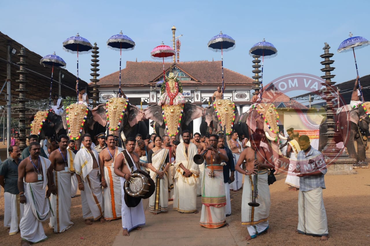 വൈക്കം: മഹാദേവ ക്ഷേത്രത്തിലെ എട്ടാം ഉൽസവ നാളായ ഇന്ന് നടന്ന ശ്രീബലിക്ക് തിടമ്പേറ്റിയത് പാമ്പാടി രാജൻ. 11 ഗജവീരൻമാർ അണിനിരന്ന എഴുന്നള്ളിപ്പിന് സ്വർണ്ണ തലെക്കെട്ട്, ആലവട്ടം, വെൺചാമരം, മുത്തുക്കുടകൾ തുടങ്ങിയവയും ഹരിപ്പാട് മുരുകദാസ്, കോട്ടയം അഖിൽ എന്നിവരുടെ നാദസ്വരവും ആലപ്പുഴ എസ്. വിജയകുമാർ, തിടനാട് അനു ജി. വേണുഗോപാൽ എന്നിവരുടെ തകിലും അകമ്പടിയായി. കാഴ്ചശ്രീബലിക്ക് ചോറ്റാനിക്കര വിജയൻ മാരാർ, ചേർപ്പുളശ്ശേരി ശിവൻ, വൈക്കം ചന്ദ്രൻ മാരാർ എന്നിവരുടെ പ്രമാണത്തിൽ 70 ലധികം കലാകാരൻമാർ പങ്കെടുത്ത പഞ്ചവാദ്യവും നടന്നു.